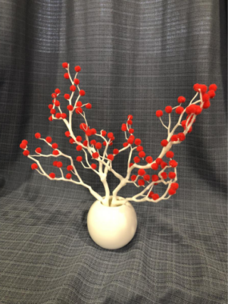制作过程,首先要把光秃秃的树干插在小小的花瓶里,用海绵垫把它固定住,然后将许许多多的红色毛毛球,根据自己的想象力,用胶水一个个粘在枝干的分叉处,最终形成一盆逼真的梅花摆件。